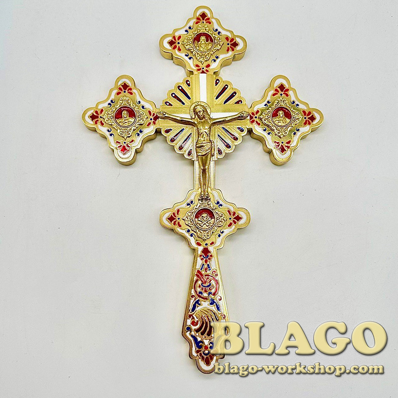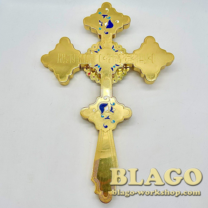 The cross is made of brass, with cast icons and enamel - made of brass, which guarantees strength and durability, and with cast icons that will give the cross a special beauty. Its length is 19 cm, width is 1 cm, and height is 29 cm, which makes it convenient for use during worship.