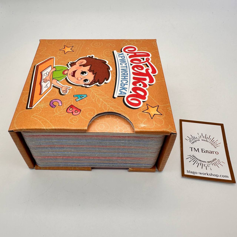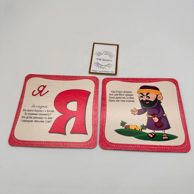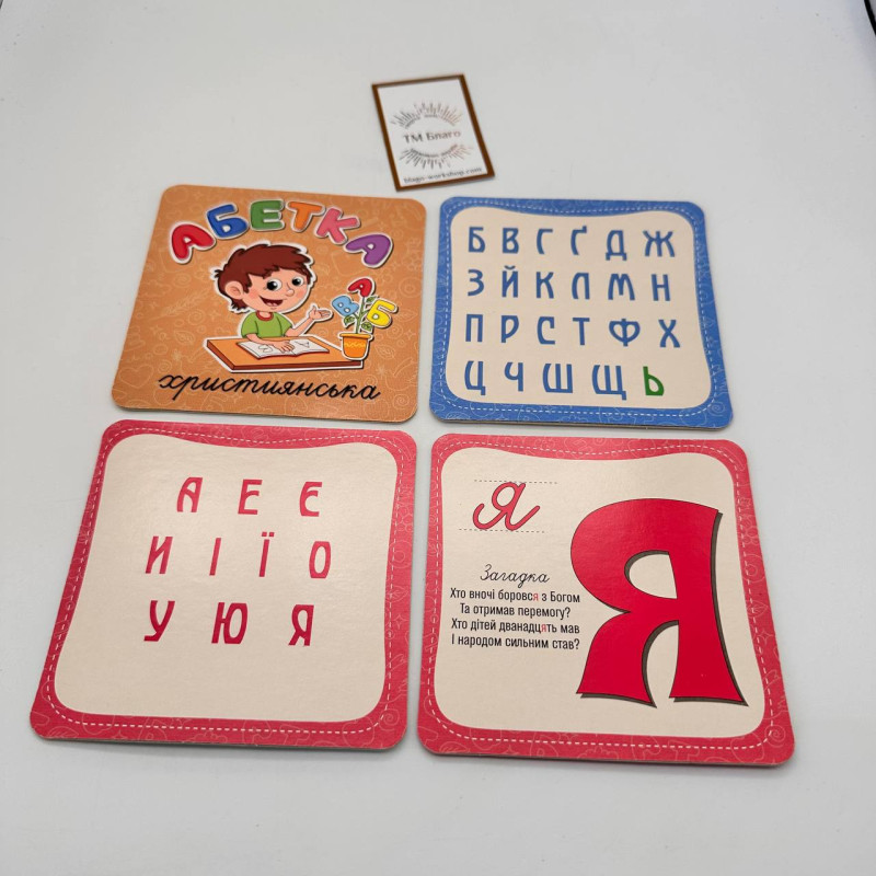 Абетка складається з 33 карток розміром 10х10 см, виготовлених з якісного картону. Кожна картка містить великі друковані та малі писані букви, віршик, загадку та кольорову ілюстрацію. Цей набір карток допомагає дітям швидше освоювати читання та письмо, розвиває їхню пам'ять через віршики, сприяє розвитку логічного мислення завдяки загадкам, поповнює словниковий запас і відкриває світ біблійних персонажів.
