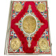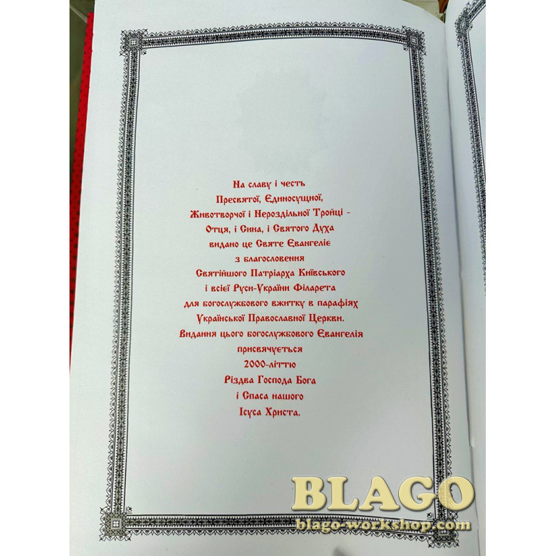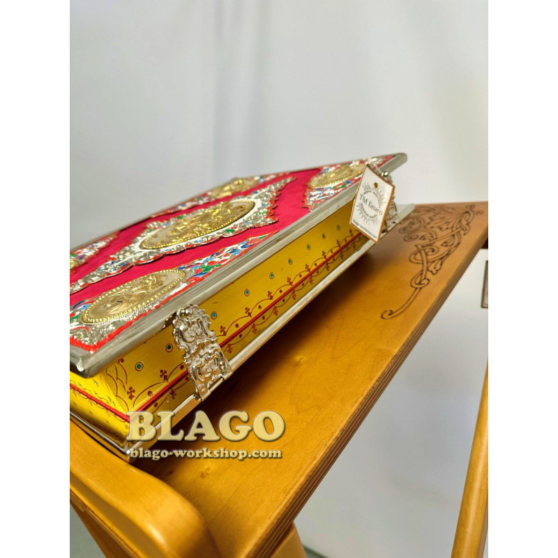Євангеліє на українській мові в нікельованому окладі з литими іконами. Розмір книги – 37х23 см, висота – 7 см. Оклад виготовлений з нікелю, оздоблений бордовим оксамитом, емалевими елементами та литими іконами .