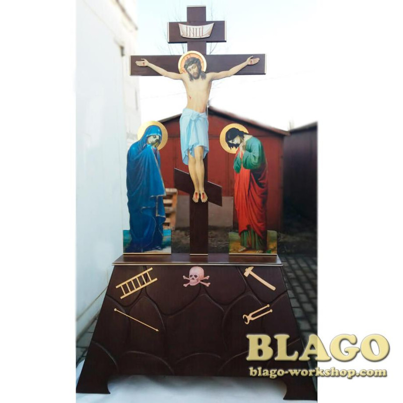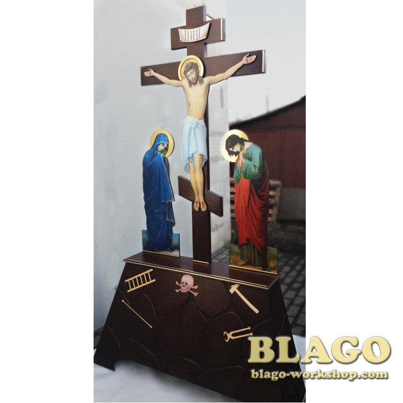 В нашей мастерской ТМ «Благо» есть большой выбор Голгоф, Воскресенья, иконы, киоты, престолы, жертвенники, подсвечники, аналои, водосвятные чаши, оклады для Евангелия, лампады, ладаны, изделия из керамики, пошивной и печатной продукции.