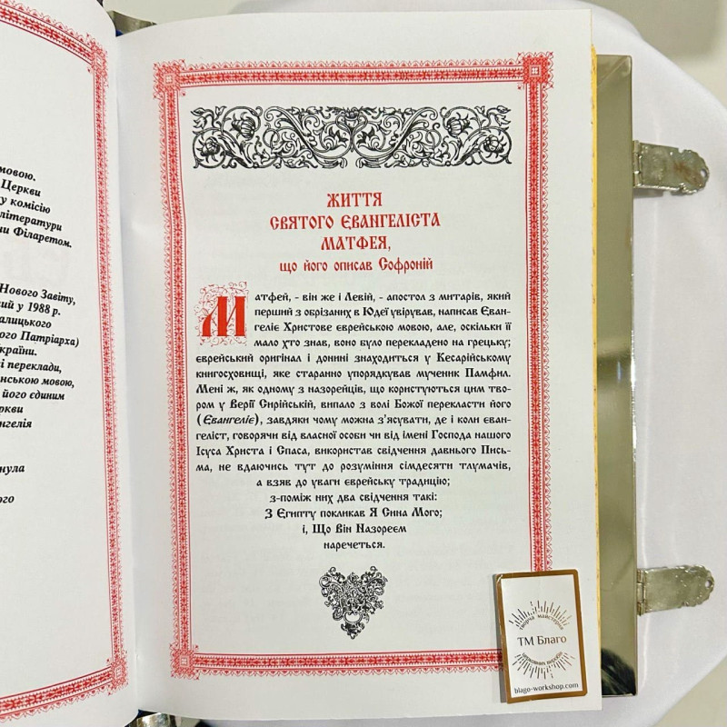 The Gospel in Ukrainian in a nickel-plated cover with laminated images. The size of the book is 37x27 cm, height - 7 cm. The cover is made of nickel, decorated with velvet, enamel elements and laminated images.