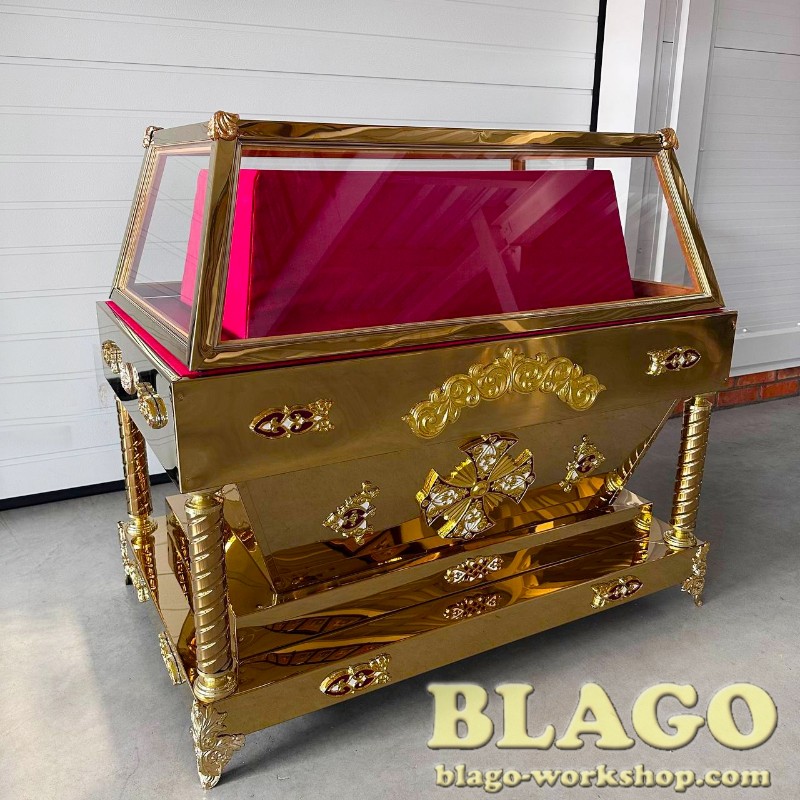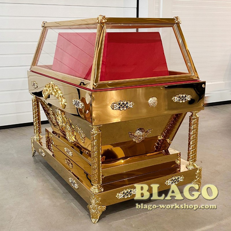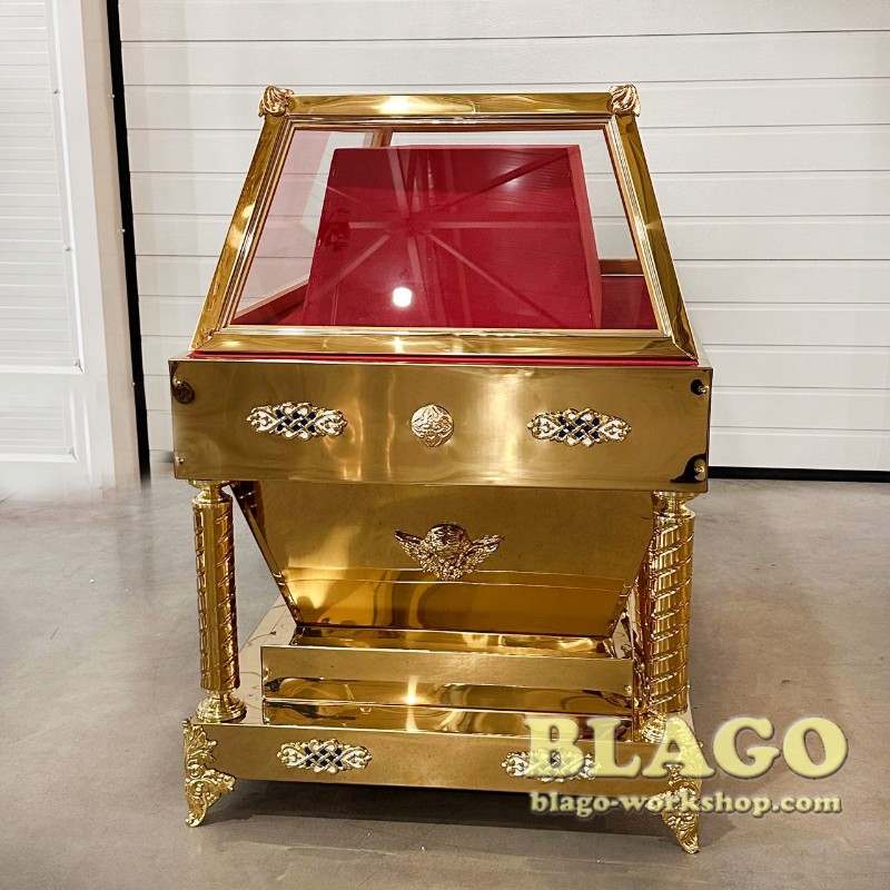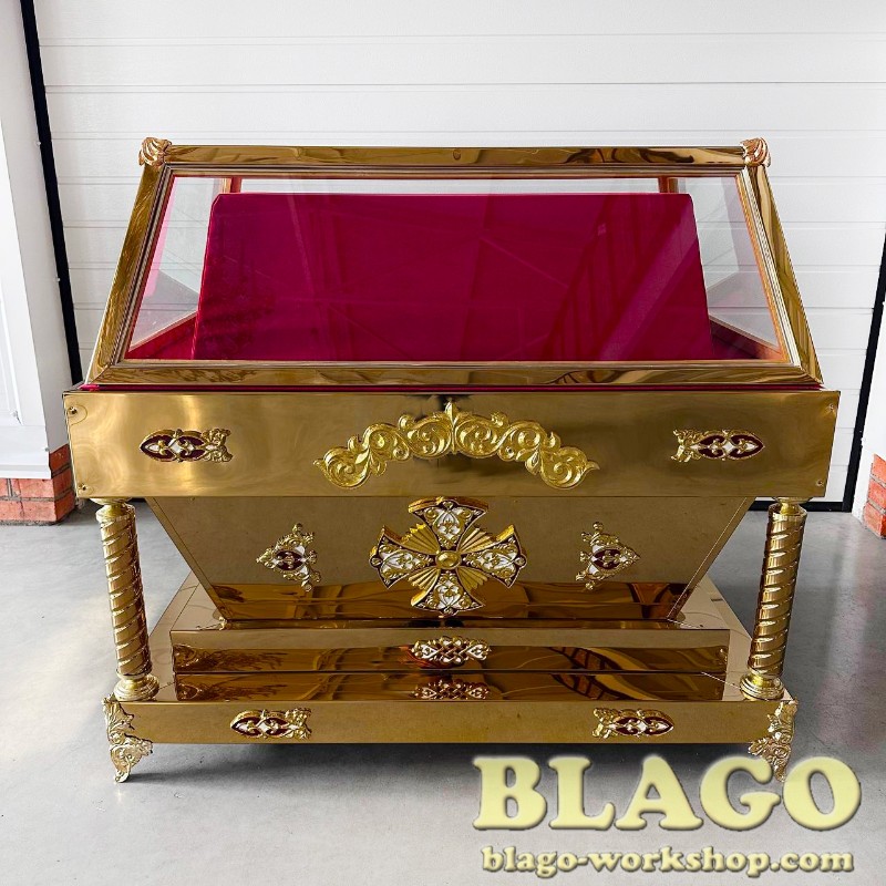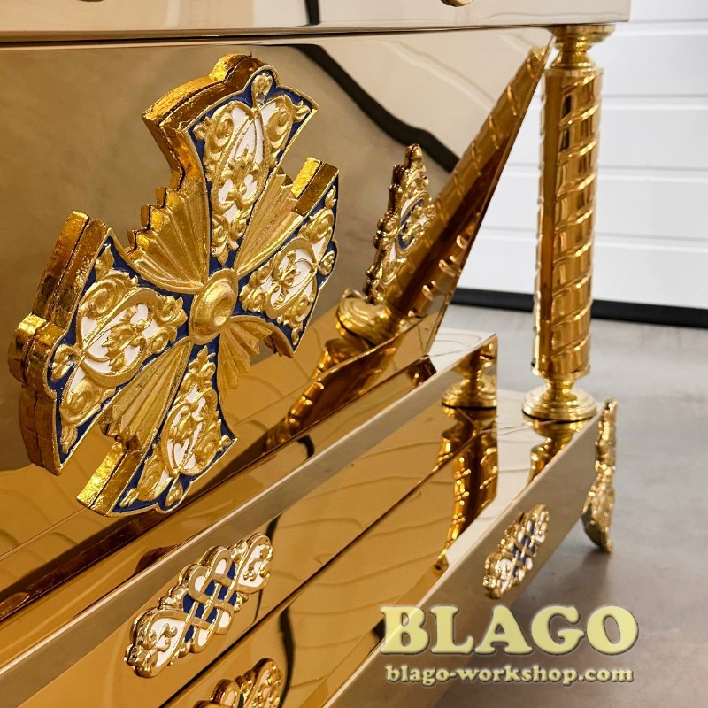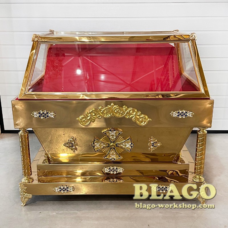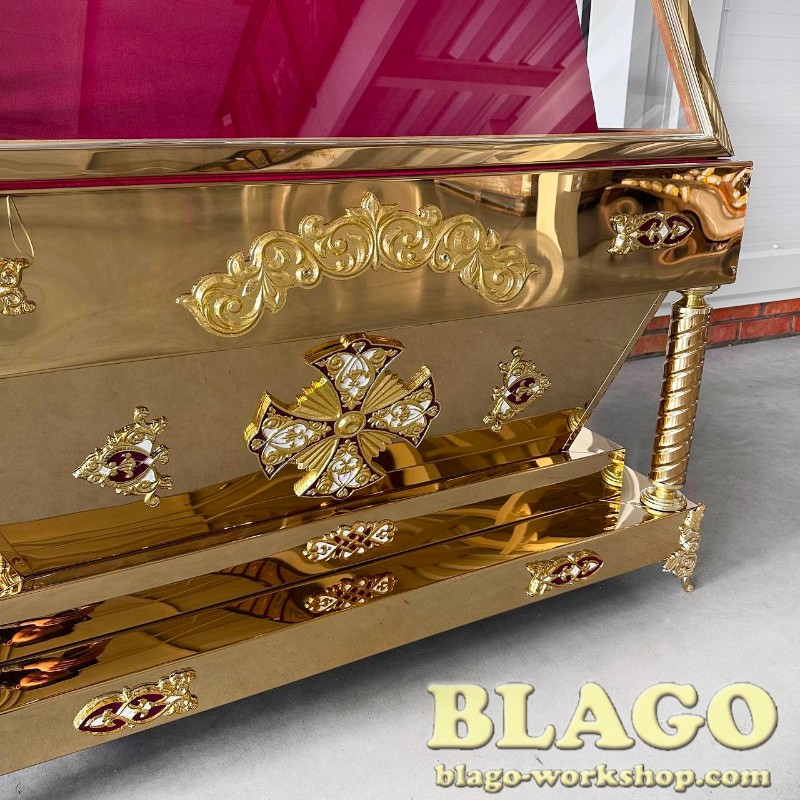 • Особливості: гробниця має накладки литва з латуні, покрита біло - блакитною емаллю. Можливе виготовлення за індивідуальним розміром та в іншому кольорі