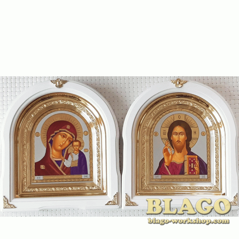 Ікони вінчальні Спаситель, Казанська арка у білій фігурній рамі, 26×29 см