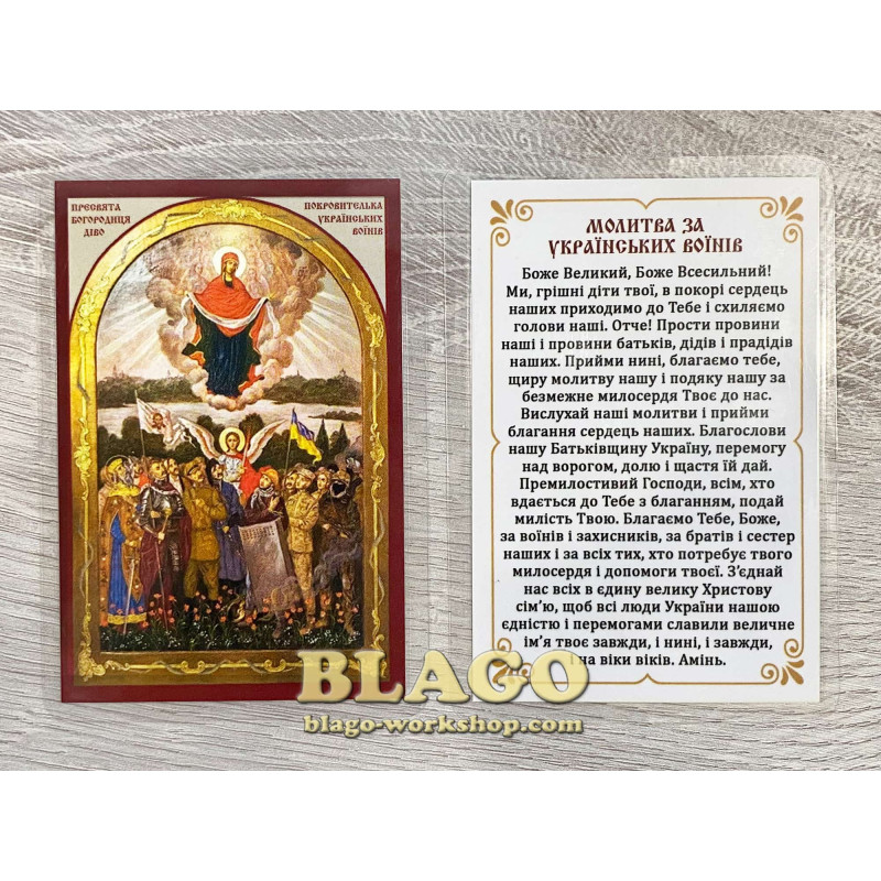 Ікона ламінована Богородиця покровителька українських воїнів, українською мовою, 6х8 см