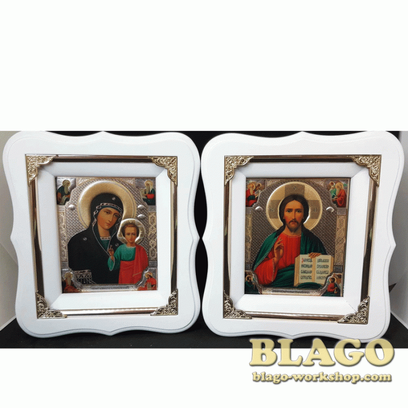 Ікони вінчальні Спаситель, Казанська у білій фігурній рамі, 17×19 см