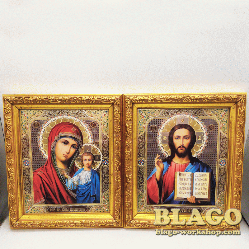 Ікони вінчальні Спаситель, Казанська у золотій фігурній рамі, 18×21 см