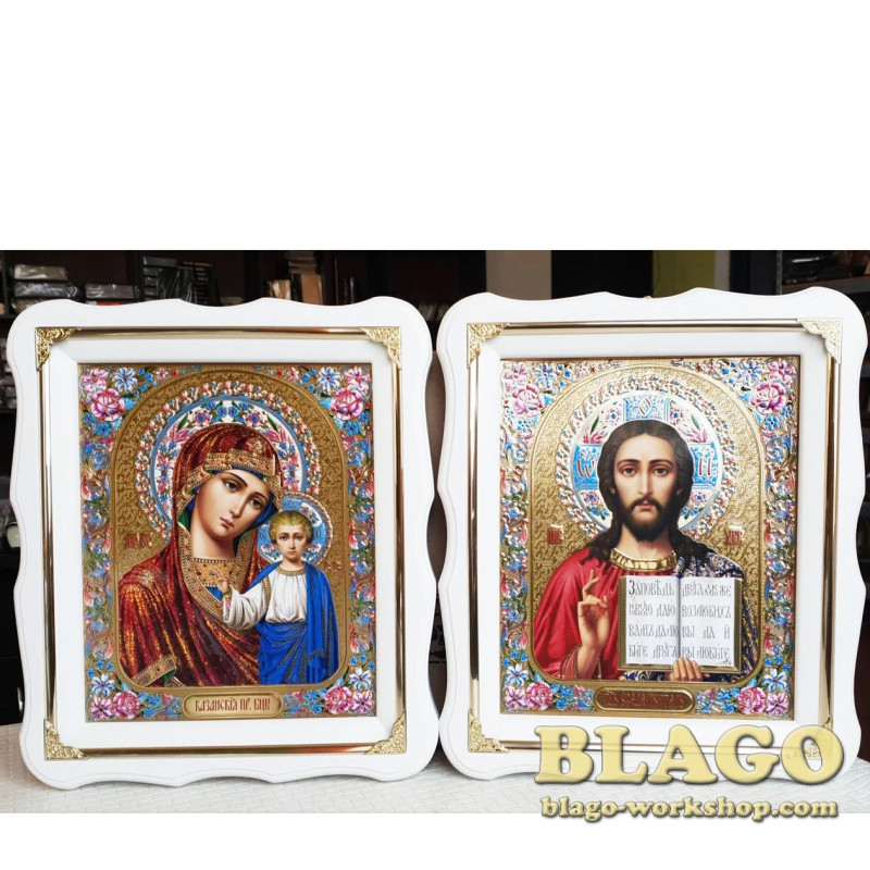 Ікони вінчальні Спаситель, Казанська у білій фігурній рамі, 26x30 см