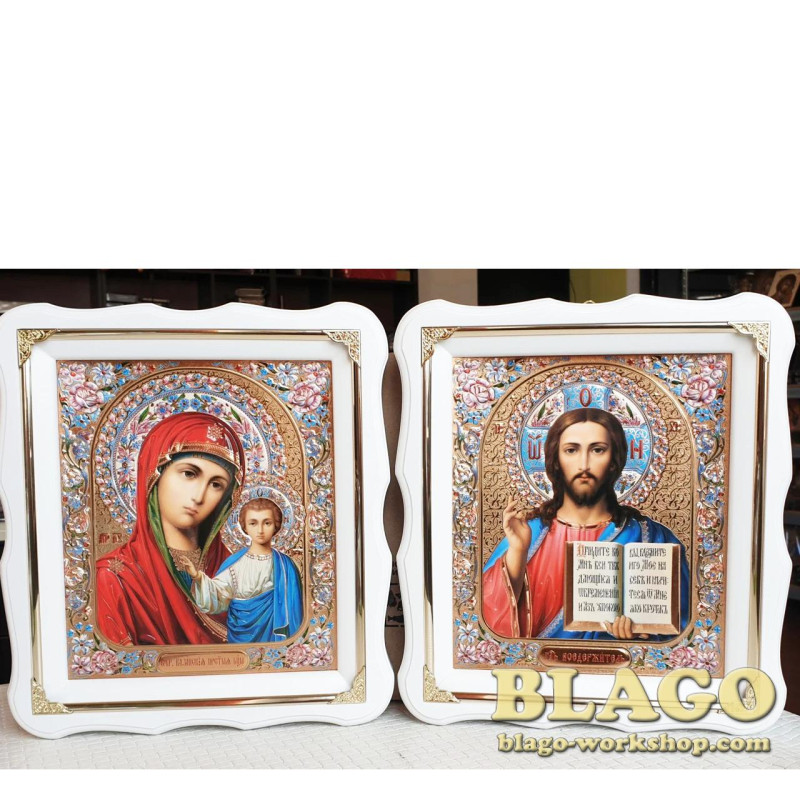 Ікони вінчальні Спаситель, Казанська у білій фігурній рамі, 26x30см