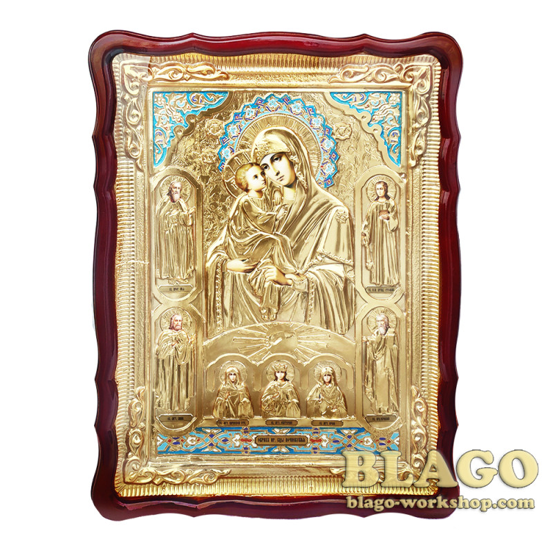 - Фон має рельєфний (об'ємний) візерунчастий малюнок, кути ікони розмальовані вручну емаллю
