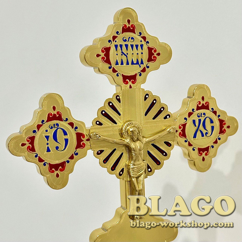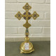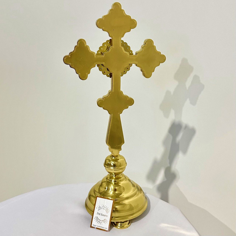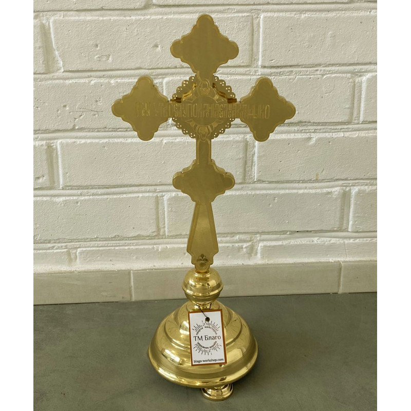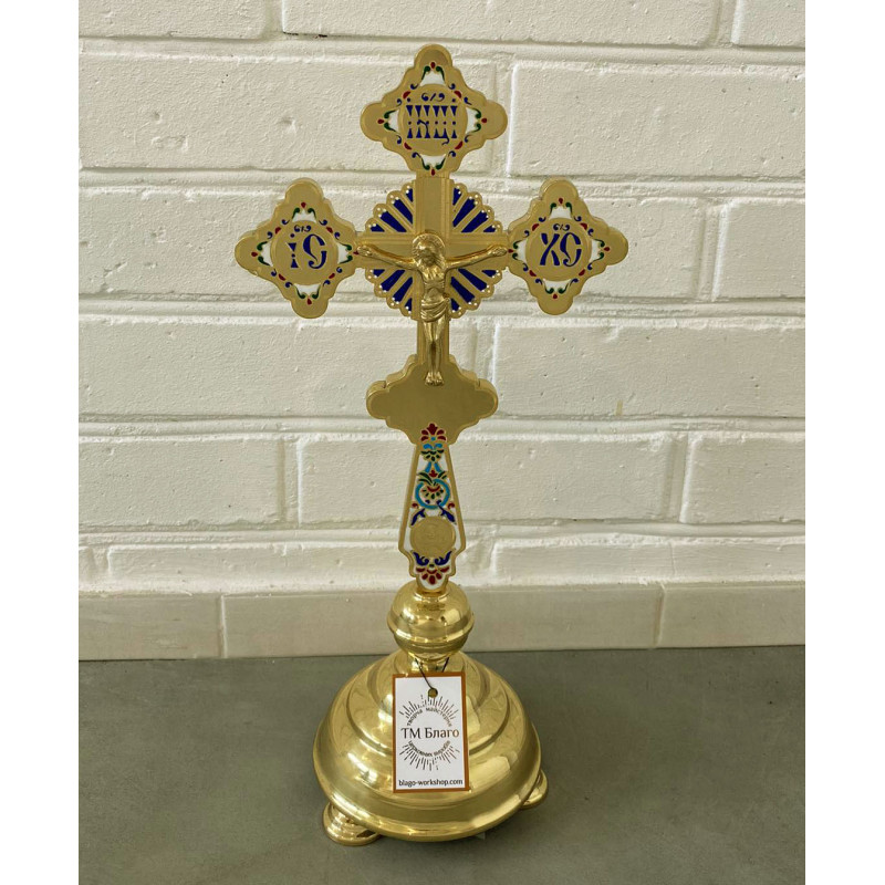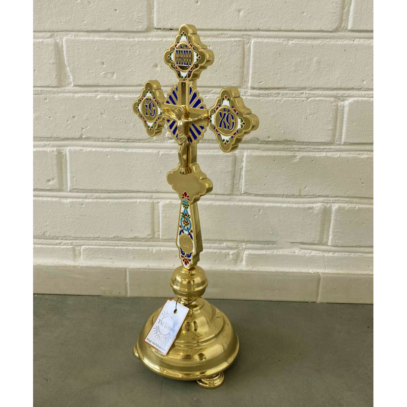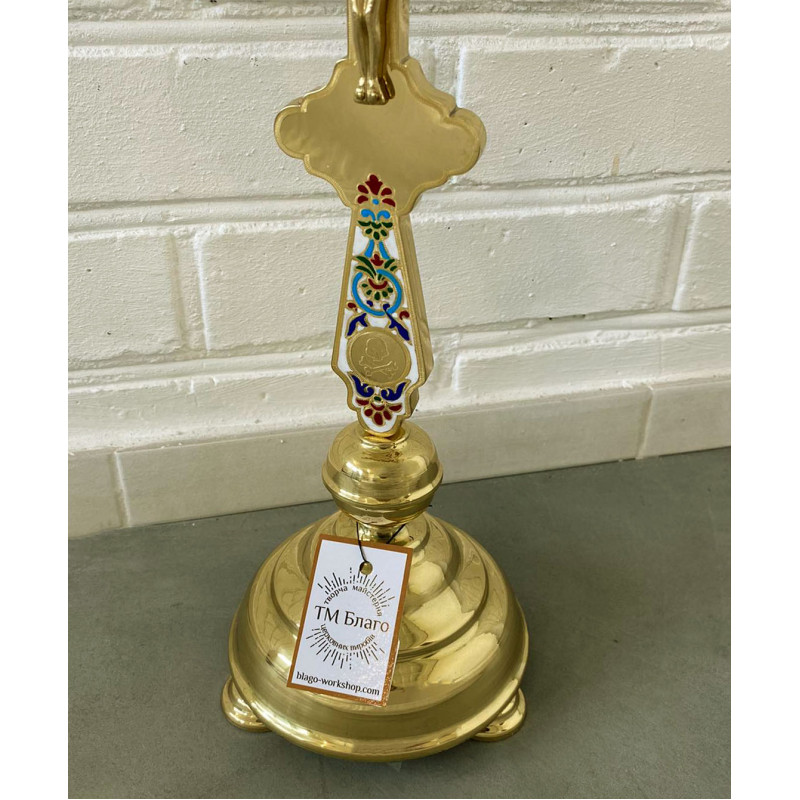 Хрест напрестольний латунний на розбірній підставці — красивий церковний атрибут, виготовлений з латуні та покриттям емалі. Має розміри 19х42 см, висота без підставки становить 29 см. Підставка діаметром 13 см забезпечує стабільність та зручність розміщення хреста на престолі. Розбірна конструкція дозволяє легко зберігати і транспортувати хрест.