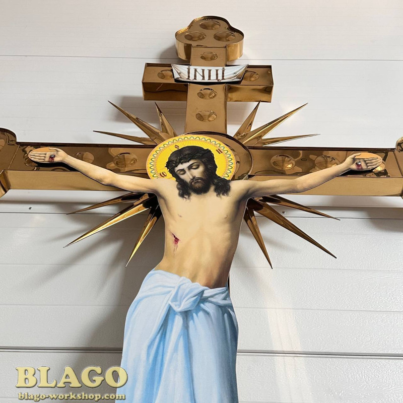 - Особенности: каркас - изготовлен из металлического профиля, который сверху обшивается булатом; изображение Иисуса Христа - изготовлено на композите, который устойчив к внешним атмосферным явлениям.