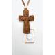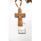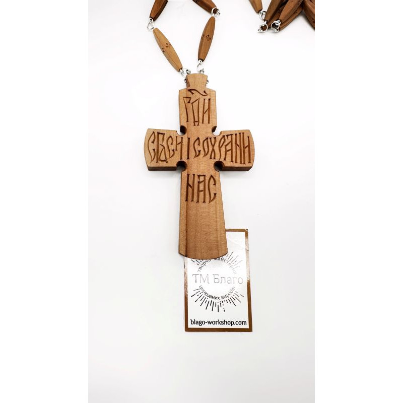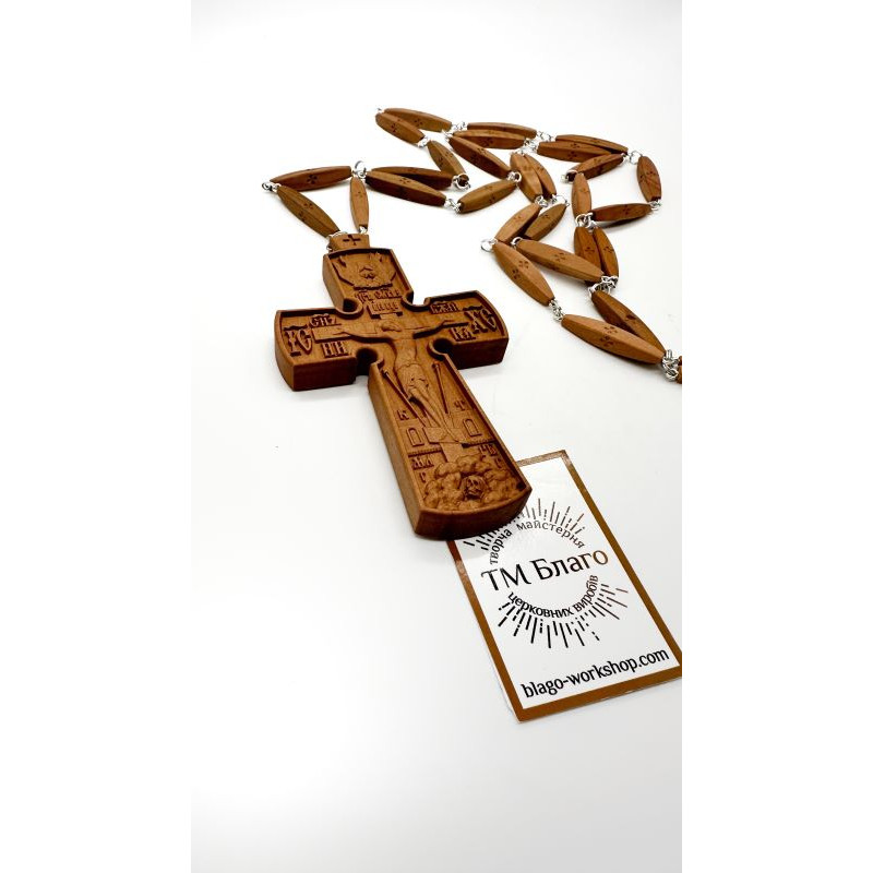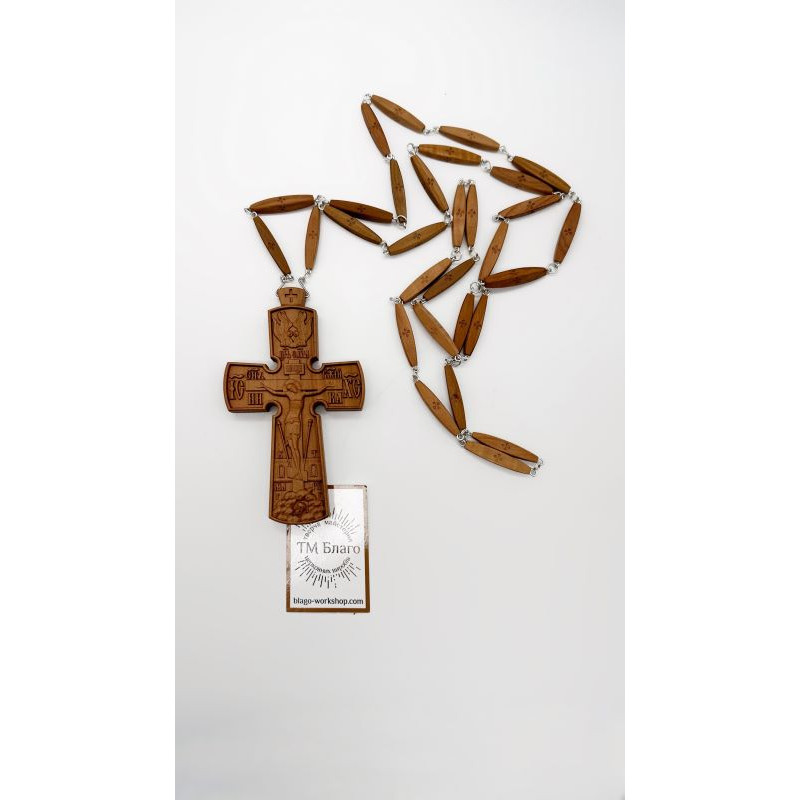 Крест с резным изображением религиозного мотива "Голгофа" и идентично тятой надписью сзади. В комплекте также цепь из деревянных сегментов и металлических креплений.