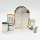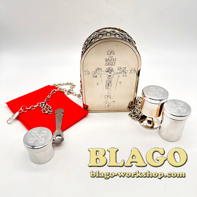 - Комплектація: дароносиця, ланцюжок, лжиця, потир, ємність 2 штуки та плат червоного кольору зі 100% котону