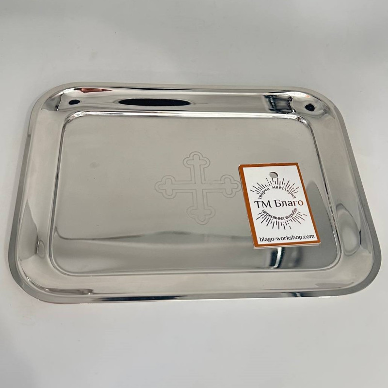 Набір для запивки включає 4 чаші об'ємом 100 мл кожна та елегантну тацю розмірами 20х15 см. Виготовлений з харчової нержавіючої сталі, цей набір поєднує в собі практичність та витонченість. Чаші мають діаметр 7 см і висоту 5 см, що дозволяє зручно використовувати їх під час обрядів. Таця має висоту 1,5 см і виконана з гравіюванням, що додає особливого духовного акценту. Цей набір чудово підійде для церковних обрядів, а також може служити гарним подарунком для храму або вірян.