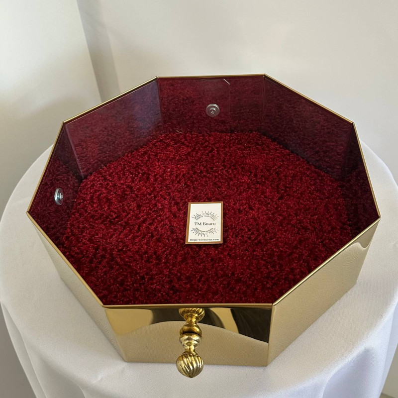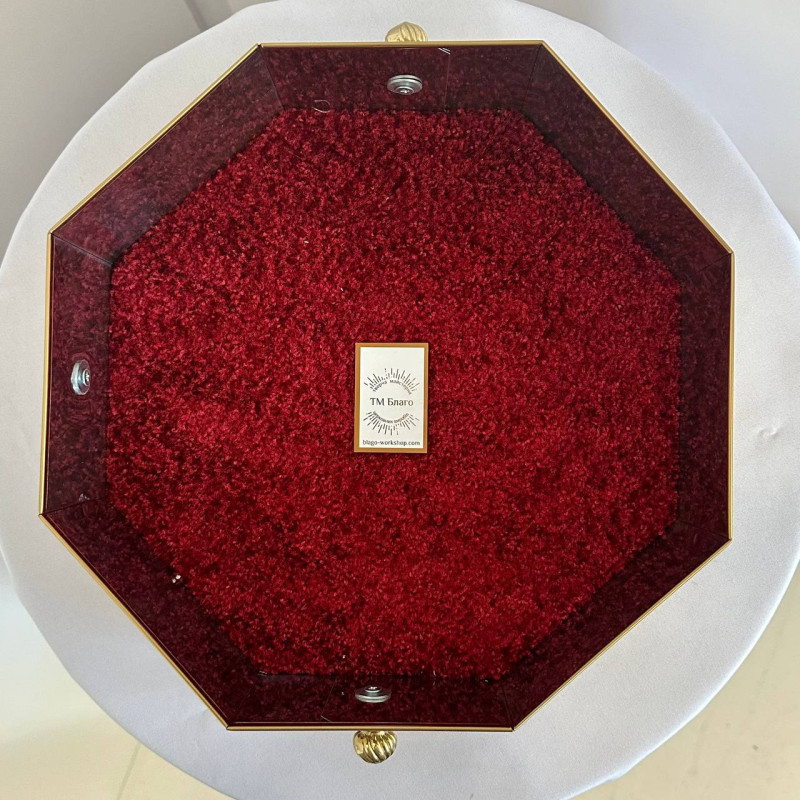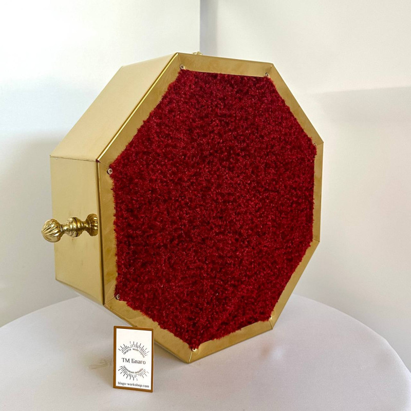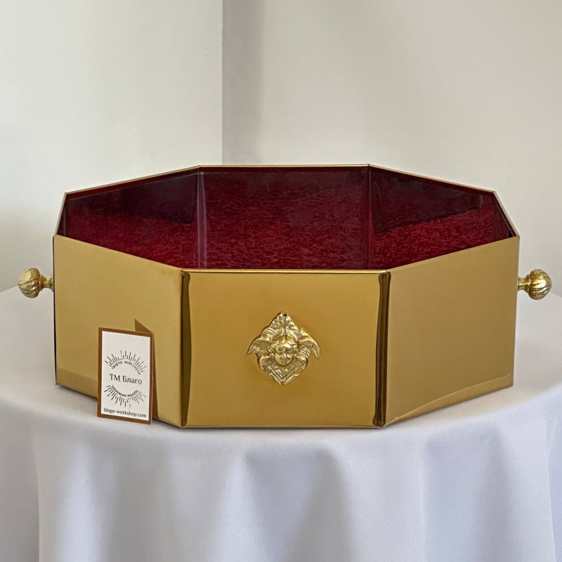 Восьмигранна таця для пожертв виготовлена з високоякісного булату, що надає їй елегантного вигляду та довговічності. Розміри таці — 31 см у діаметрі та 10,5 см у висоту, що забезпечує зручність для використання в будь-якому храмі або місці для пожертв. Вона оздоблена декоративними накладками з латунного литва і оснащена двома зручними ручками для легкості перенесення.