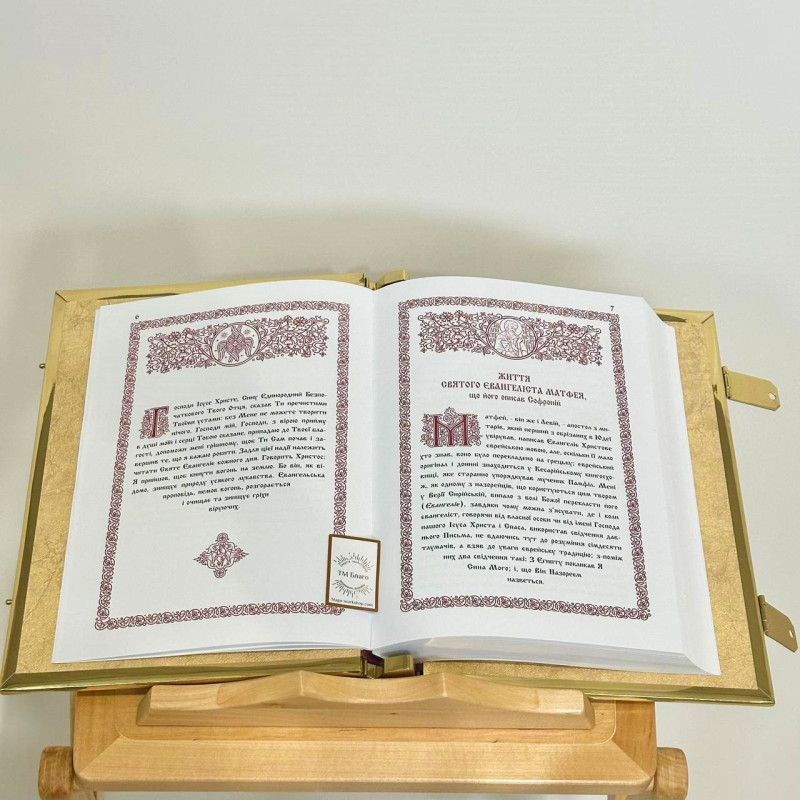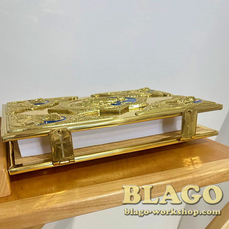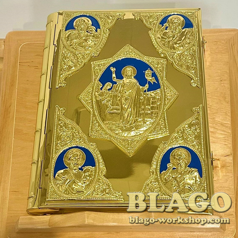 Евангелие на украинском языке в латунном окладе с литыми иконами. Размер книги - 37х29 см, высота - 7 см. Оклад изготовлен из латуни, украшен синей эмалью, и литыми иконами.