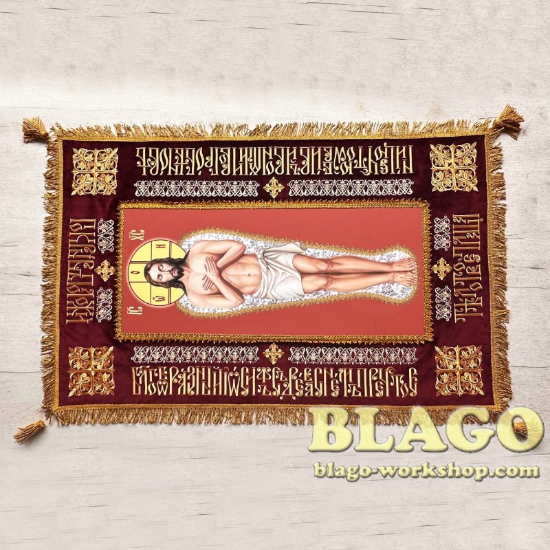 • Особливості: плащаниця оздоблена машинною вишивкою металізованими нитками. Основа виготовлена із ламінованого друку на ПРХ (це якісний довговічний пластик, стійкий до вологи та води, з ним можливе використання плащаниці на вулиці).