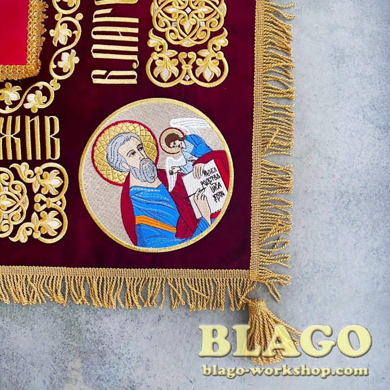 • Особливості: плащаниця оздоблена машинною вишивкою, нитка - металізована, на кутах вишиті ікони чотирьох Євангелістів: Матвій, Марко, Лука, Іван. Можливе написання іншою мовою та виготовлення за індивідуальними розмірами