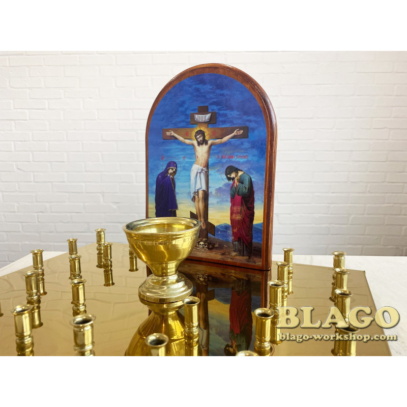 - Материал: основа ДСП 16мм, металл булат (нержавейка с напылением нитрид титана), лампада и свечодержатели латунь, печатная литография
