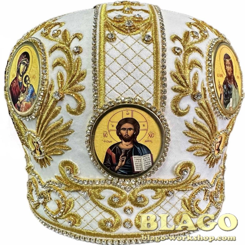 • Features: white miter embroidered with gold threads.