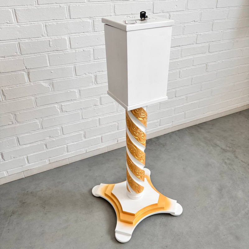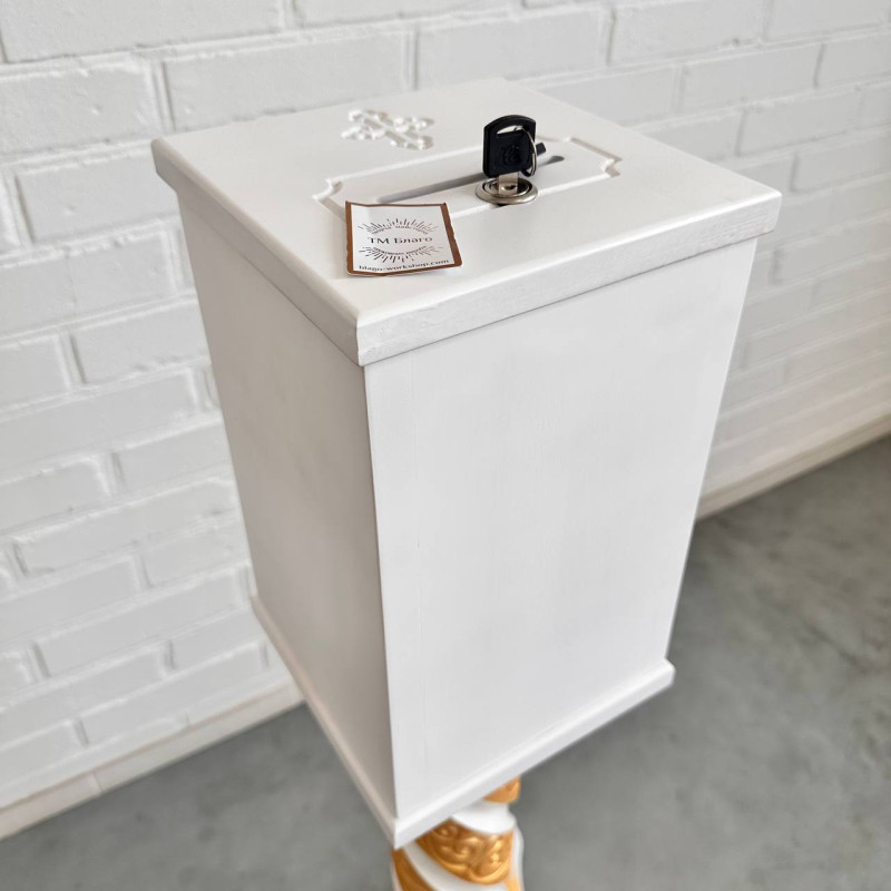 Floor standing metal donation box with a box, 25.5x25.5x76.5 cm