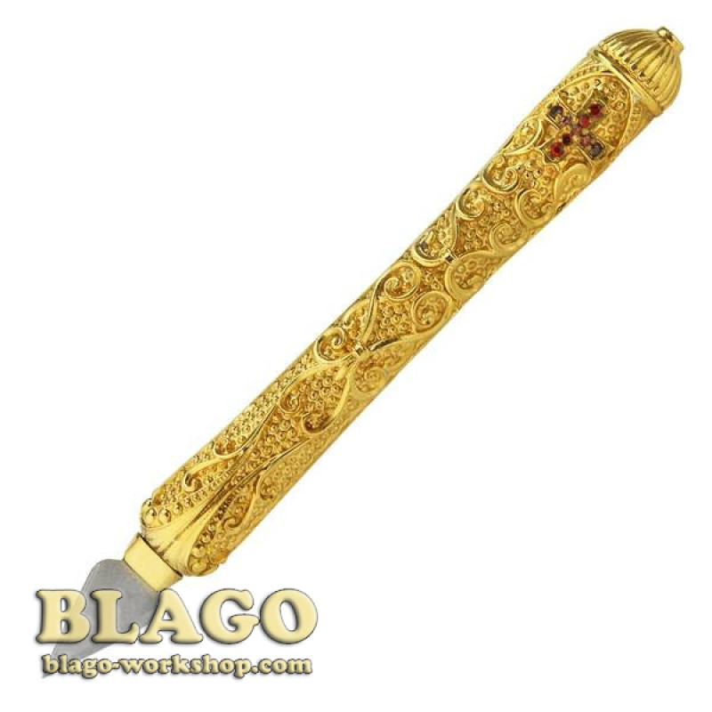 - Ручка копеет изготовлена из латуни, а лезвие из нержавеющей стали. Ручка украшена объемным растительным орнаментом и декорирована вставками качественных камней – ручного закрепления. Клинок изготовлен из стали и прошел дополнительную заточку.