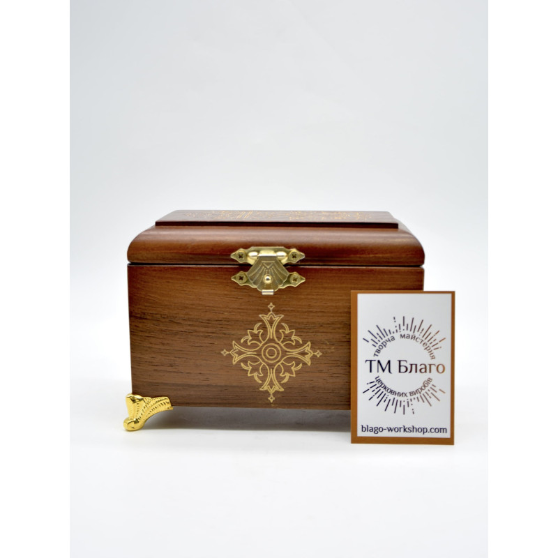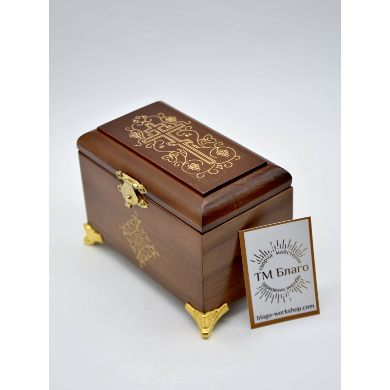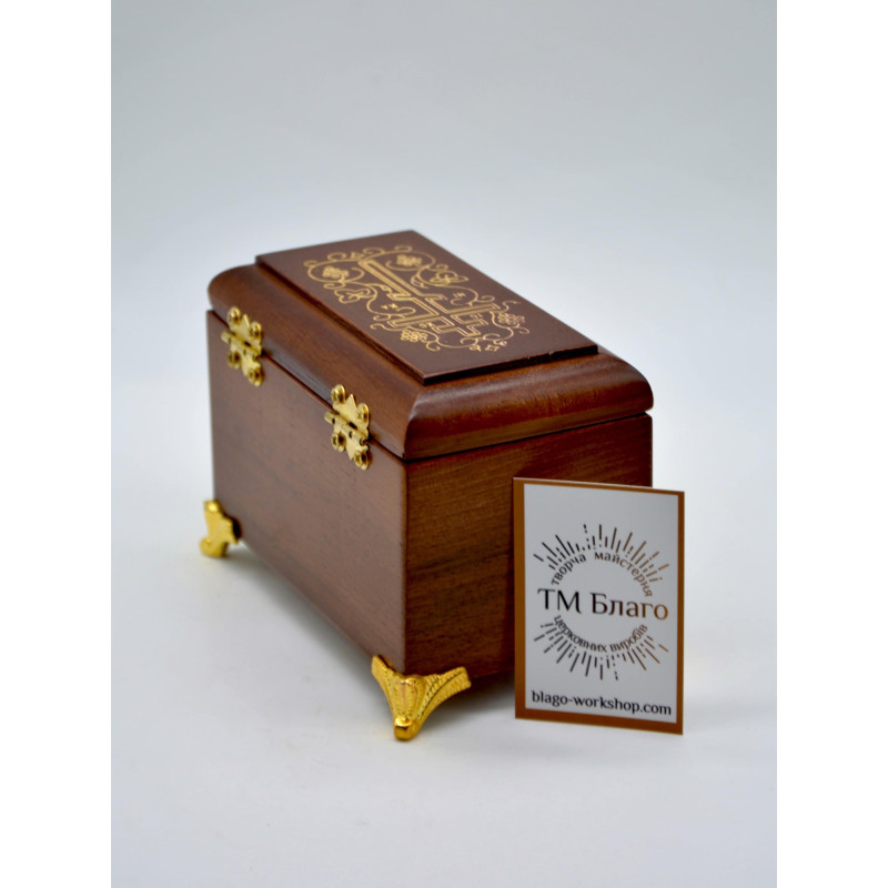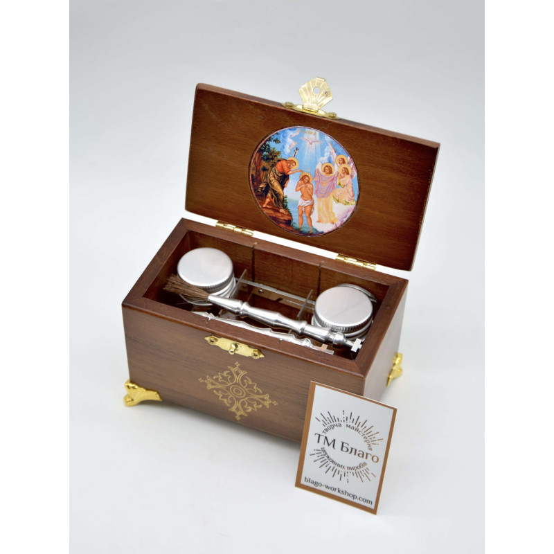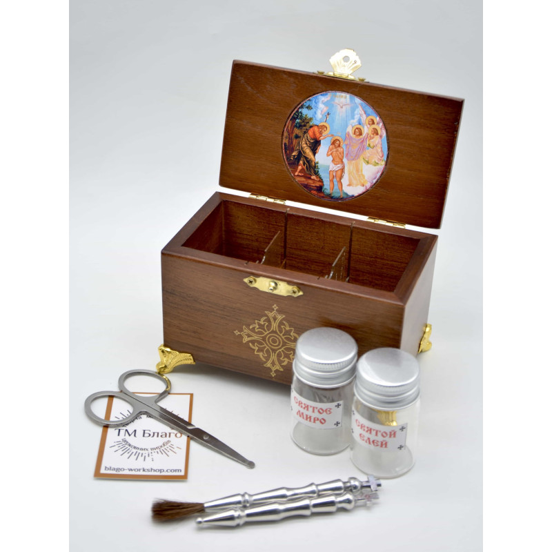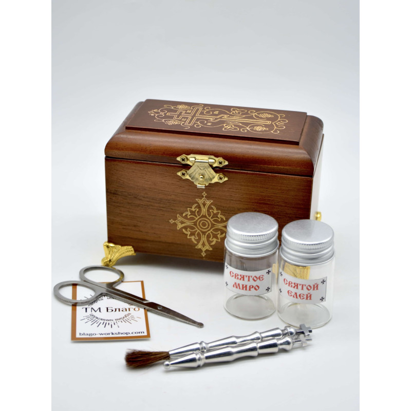 - В комплект ящика входит: кисточка, стрючица, ножницы, стеклянные сосуды для елея и мира