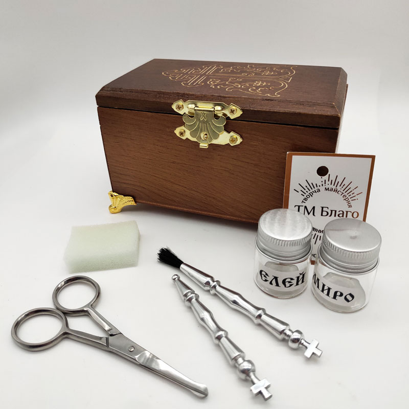 - В комплект ящика входит: кисточка, стрючица, ножницы, стеклянные сосуды для елея и мира