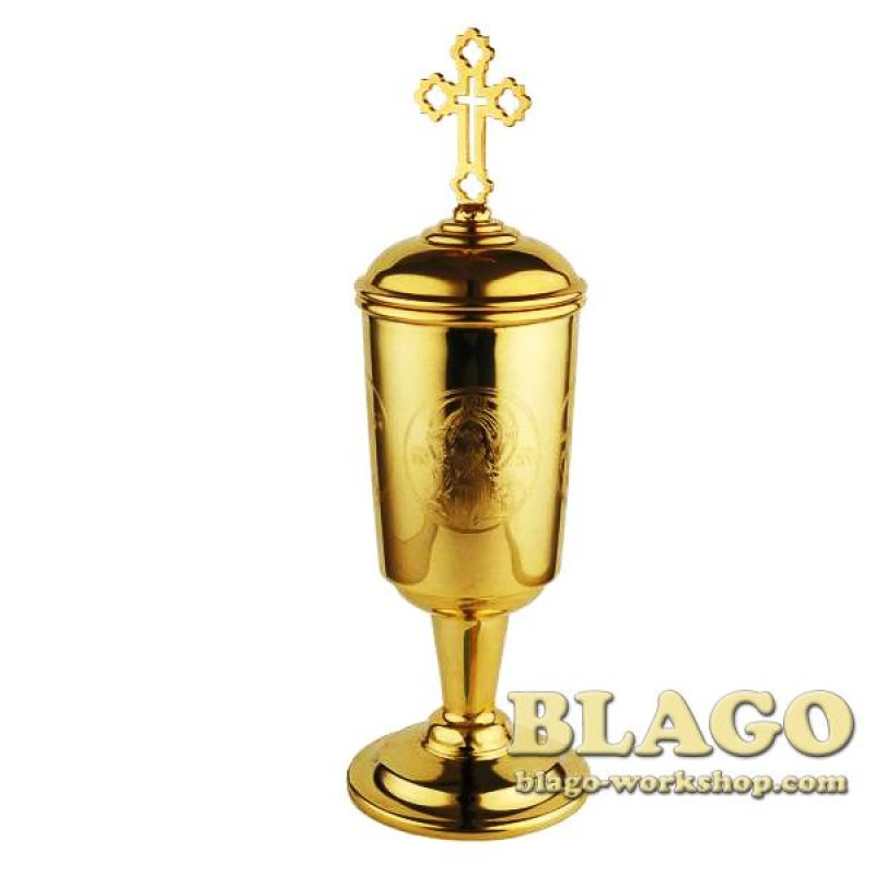 - Елейница изготовлена из латуни и покрыта позолотой, нанесена гальваническим способом. Чаша декорирована орнаментом.